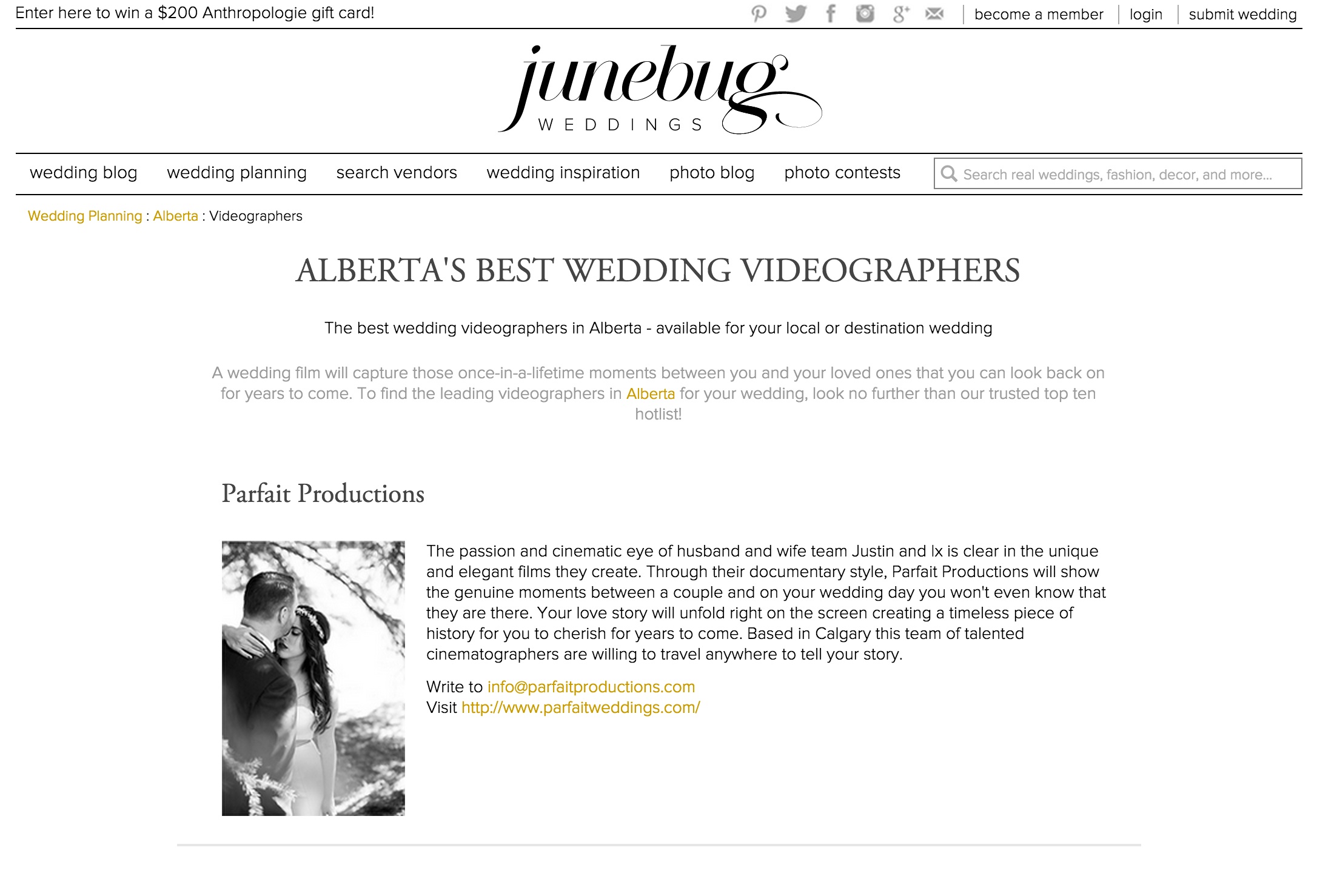 Today we received a wonderful surprise, Parfait Productions {Justin + Ix} has been selected to be part of the Junebug's Best Videographer List! Follow the link here for the whole low down and sweet write up they did about our team. All the hard work from the past 4 odd years is being recognized in our community and we couldn't be more excited and grateful. Thank you to all of our outstanding clients and community. You are truly are our biggest fans and we would still be serving up cocktails to wedding planners (true story!) without your support!!